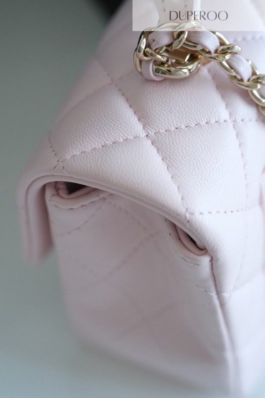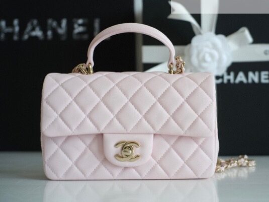 This Chanel Mini Flap Bag in Light Pink is crafted from lambskin leather and features signature diamond quilting.