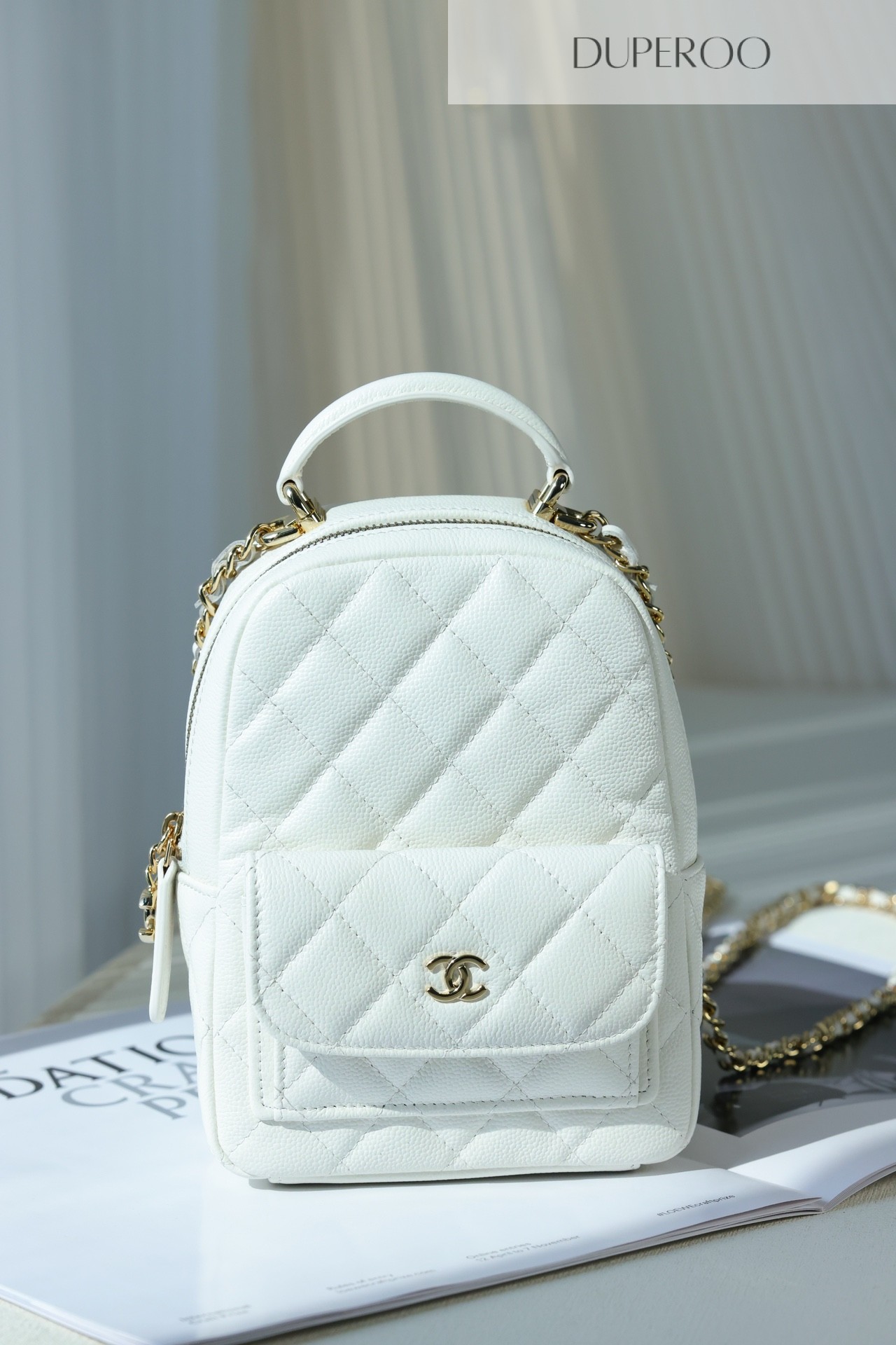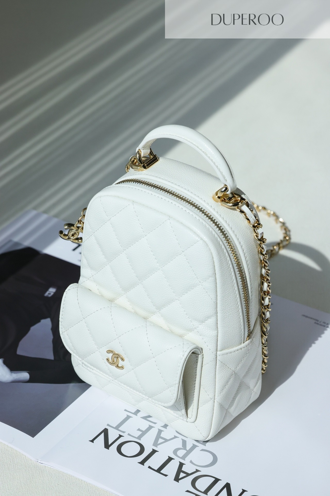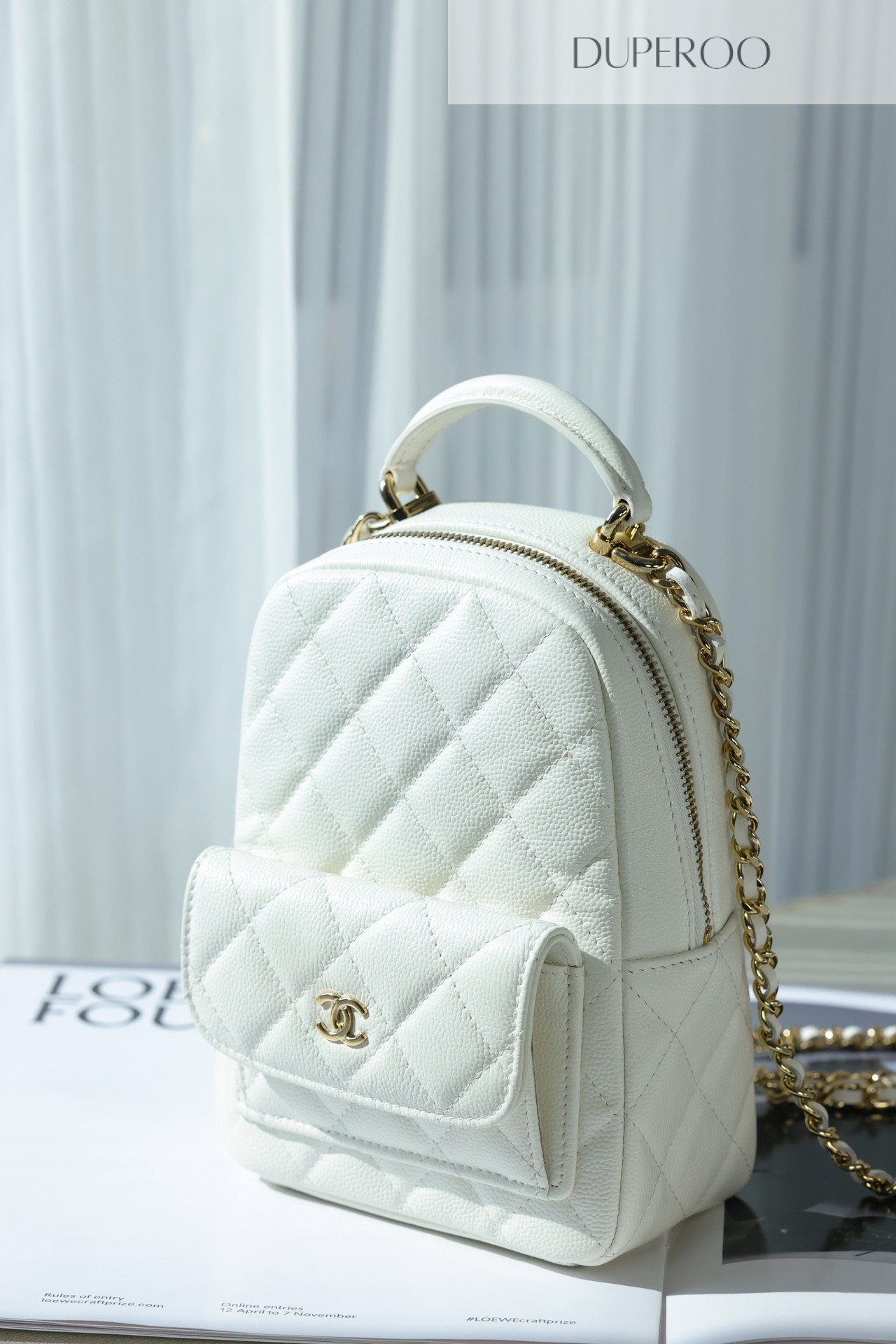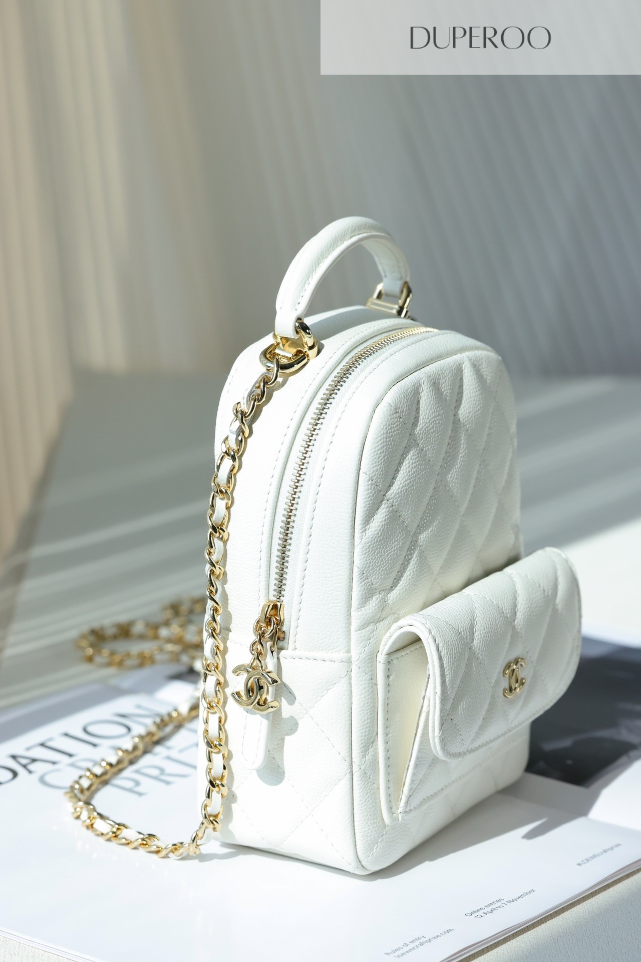 This Chanel Mini White Classic Backpack is crafted from caviar leather and features signature diamond quilting.