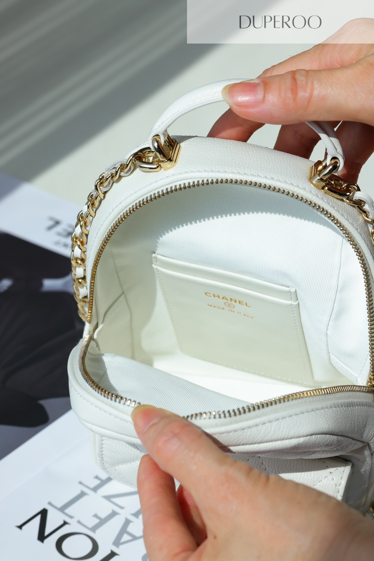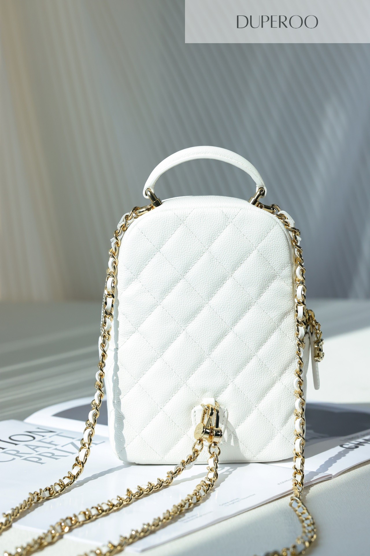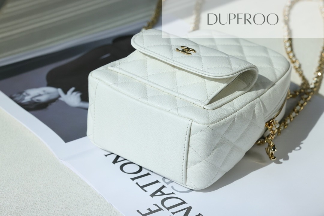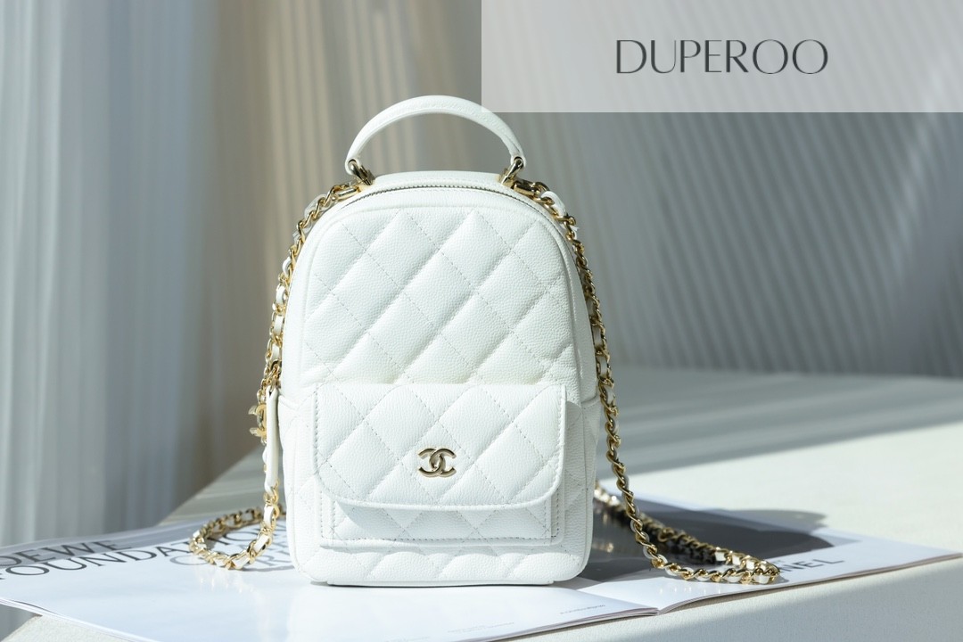 This Chanel Mini White Classic Backpack is crafted from caviar leather and features signature diamond quilting.