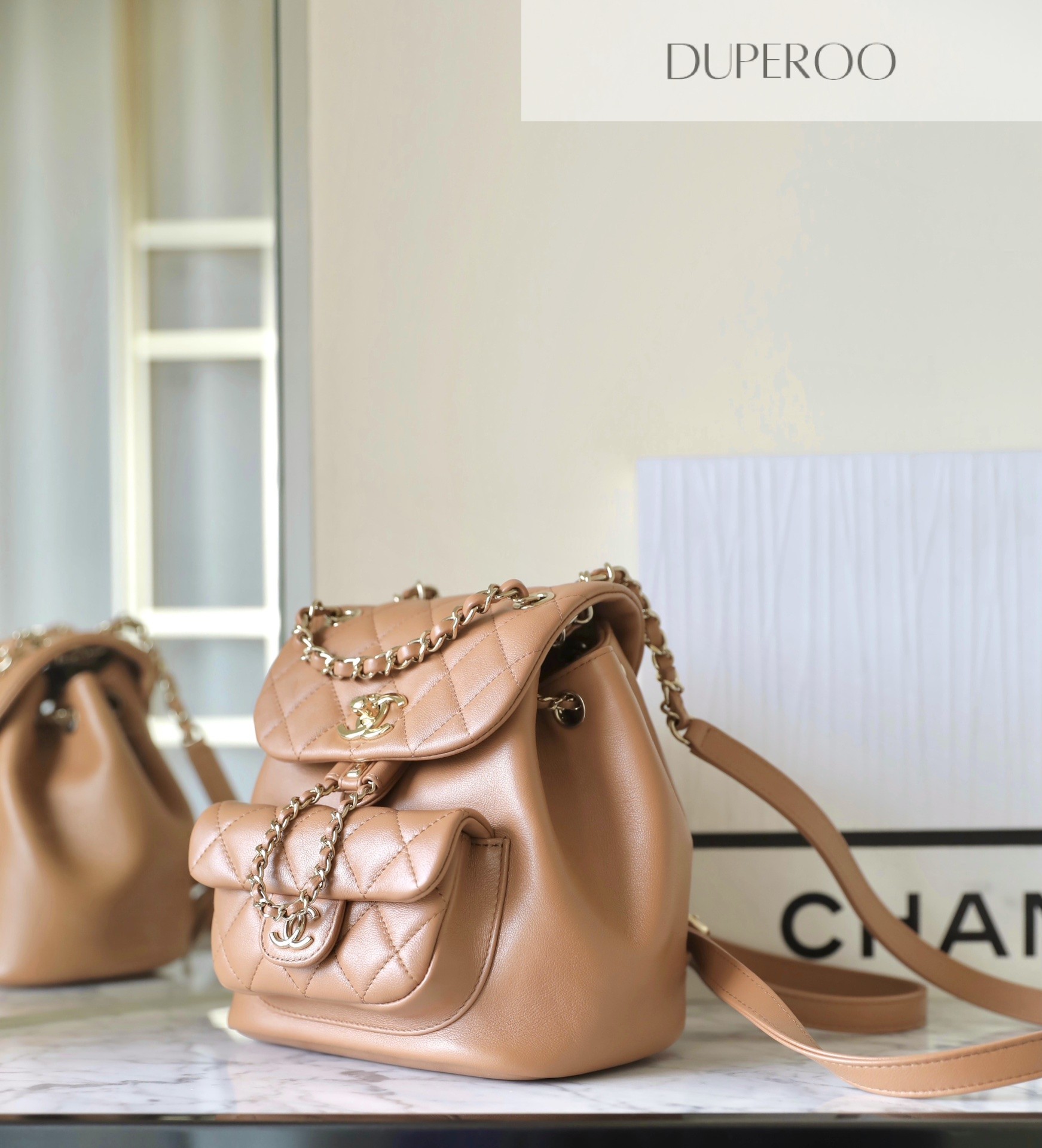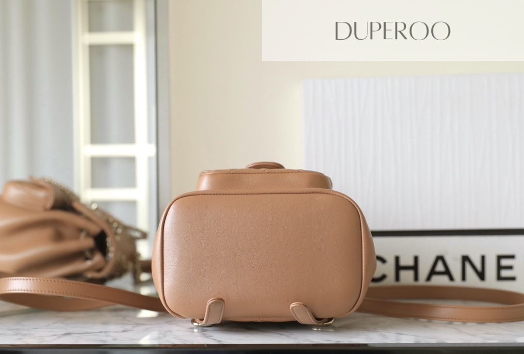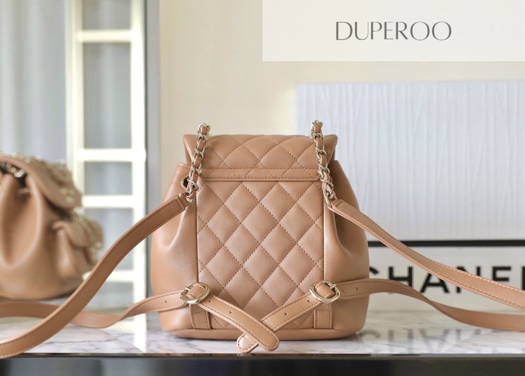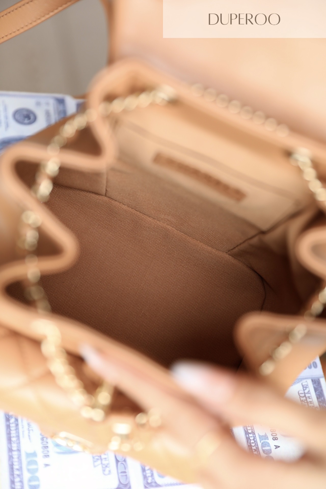 This Chanel Small Duma Drawstring Backpack in Camel is crafted from Calfskin Leather that is a perfect blend of vintage charm and modern sophistication.