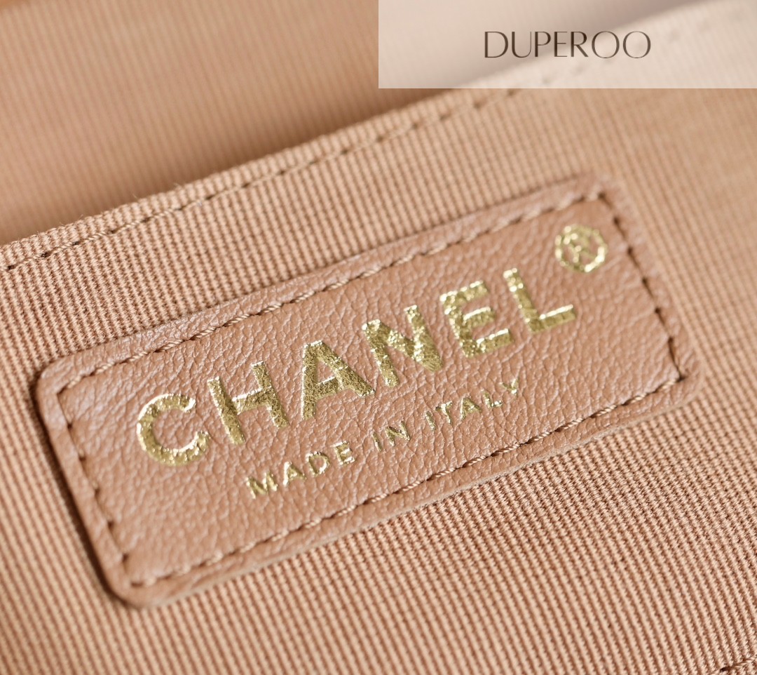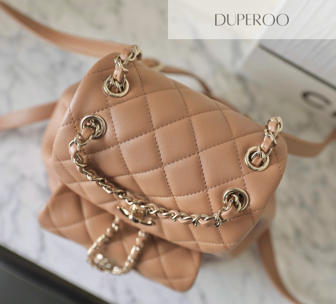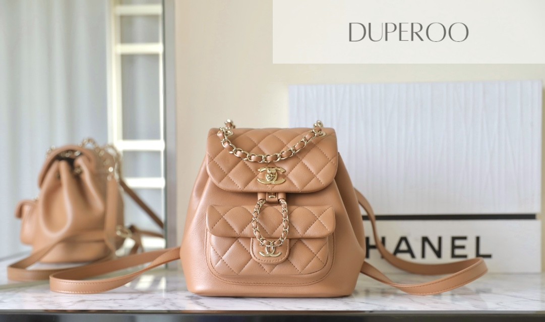 This Chanel Small Duma Drawstring Backpack in Camel is crafted from Calfskin Leather that is a perfect blend of vintage charm and modern sophistication.