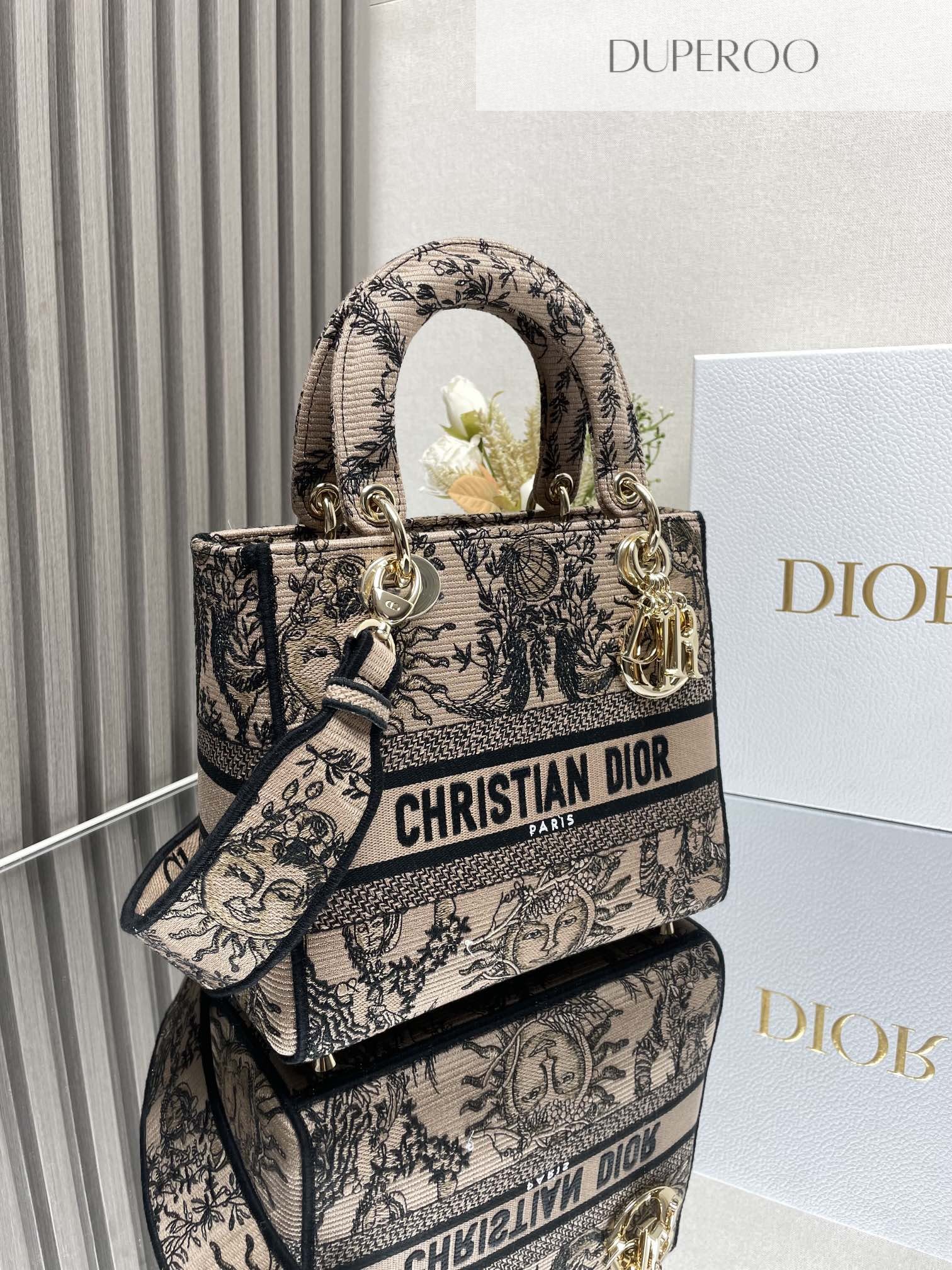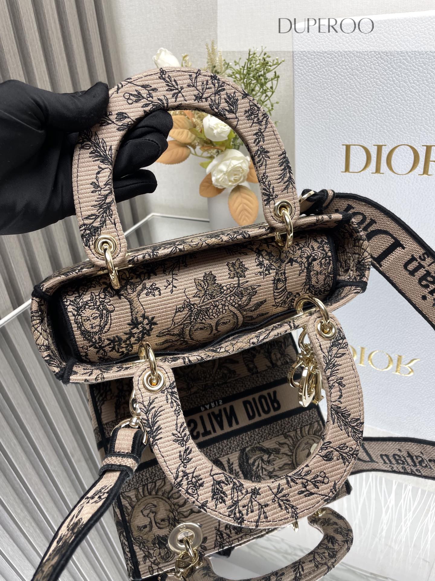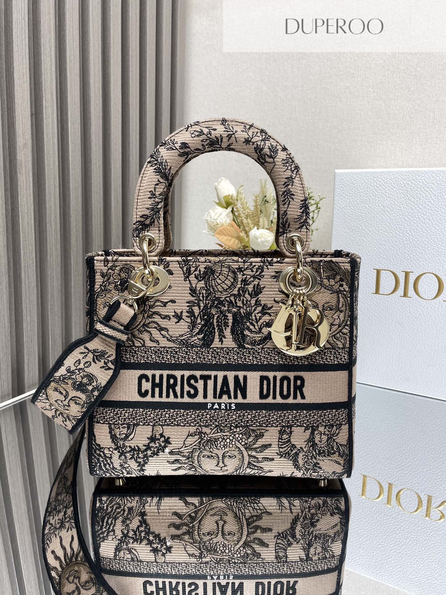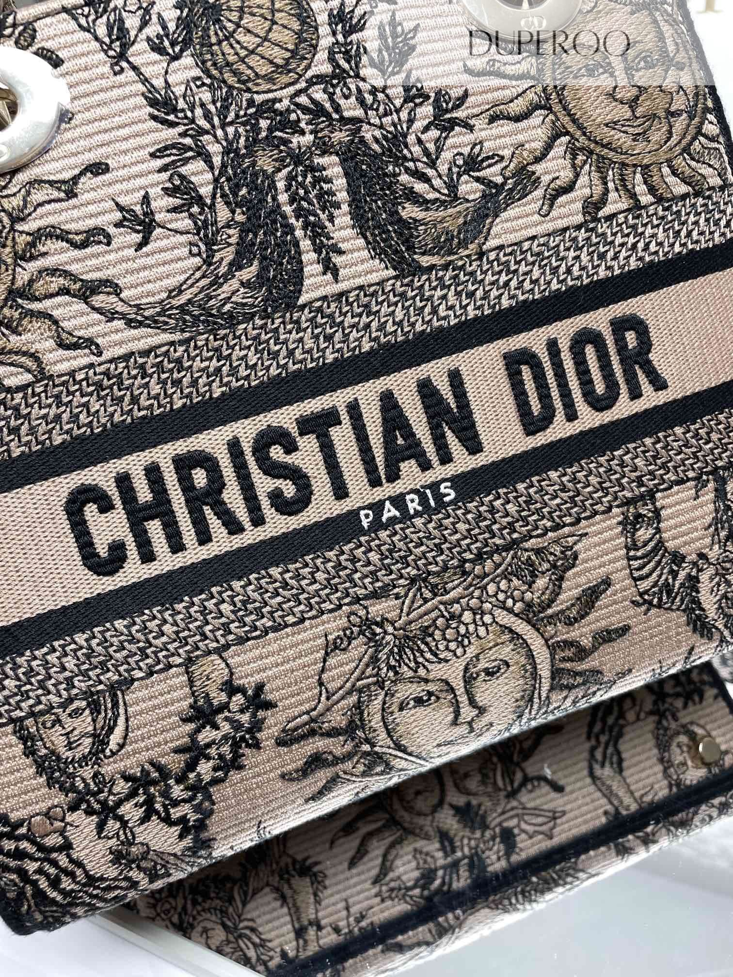 This Christian Dior Beige and Black Lady D-Lite is crafted from embroidered canvas showcasing a “Toile de Jouy” motif.