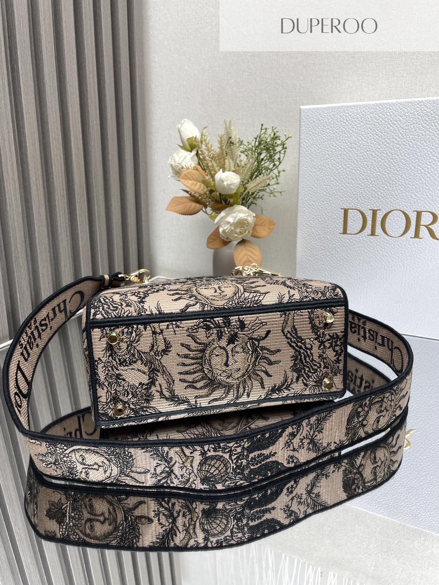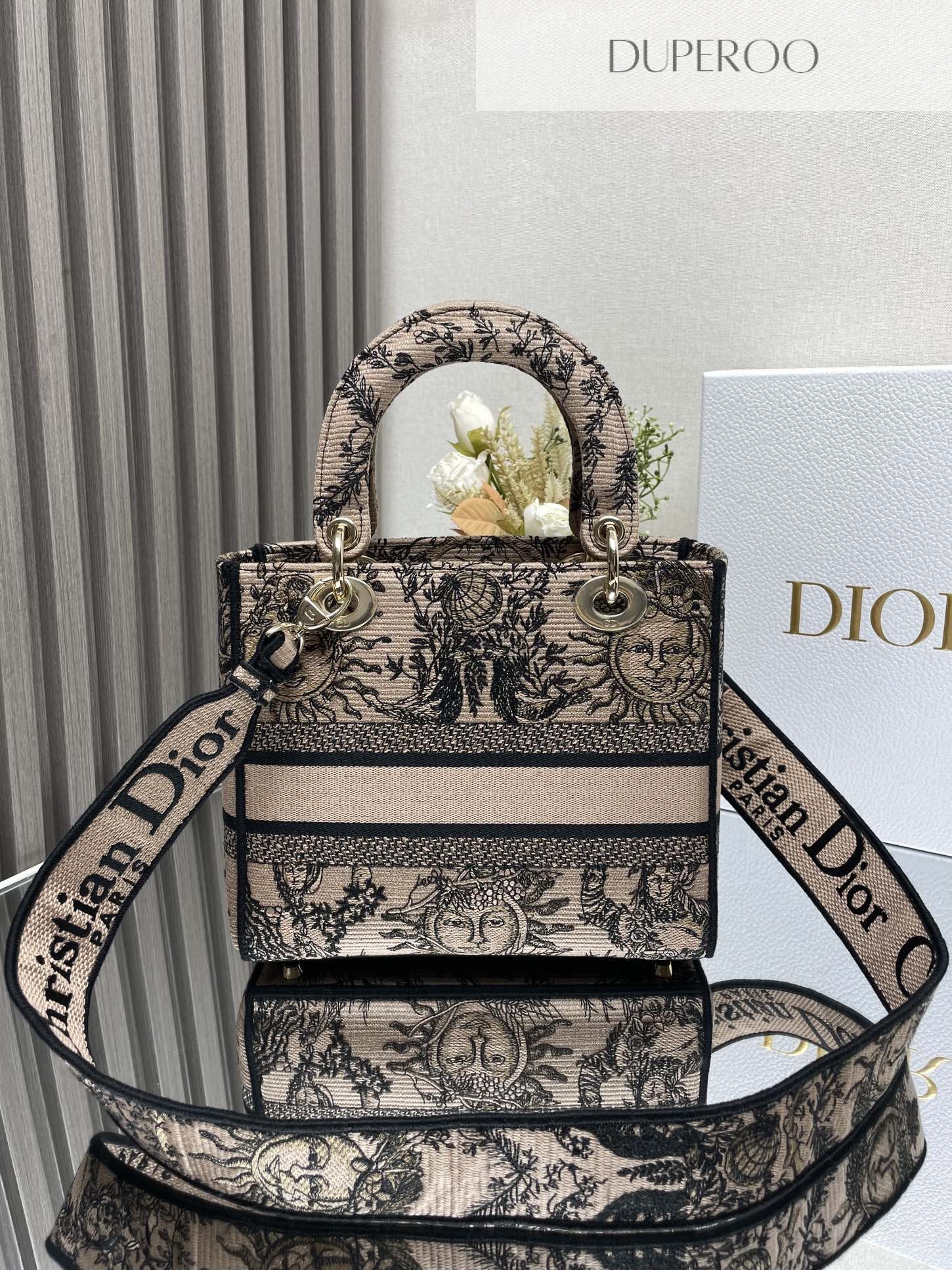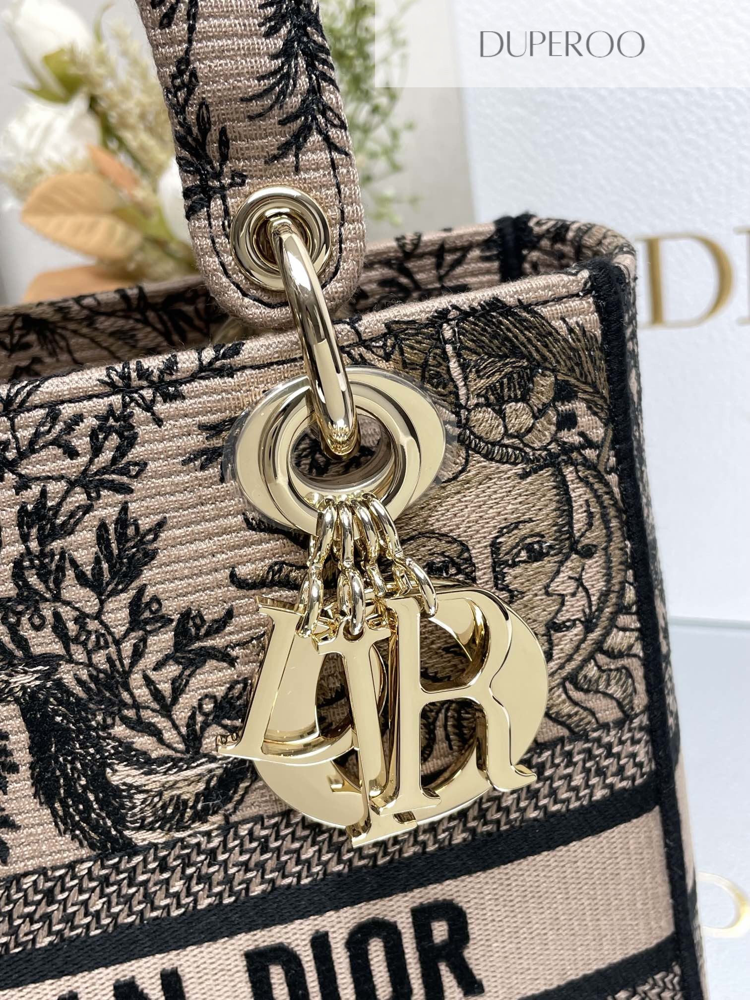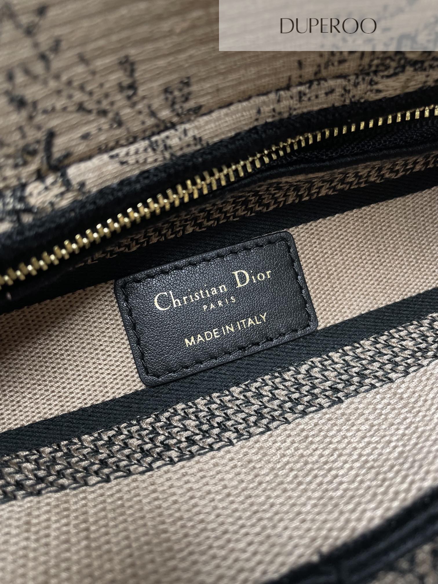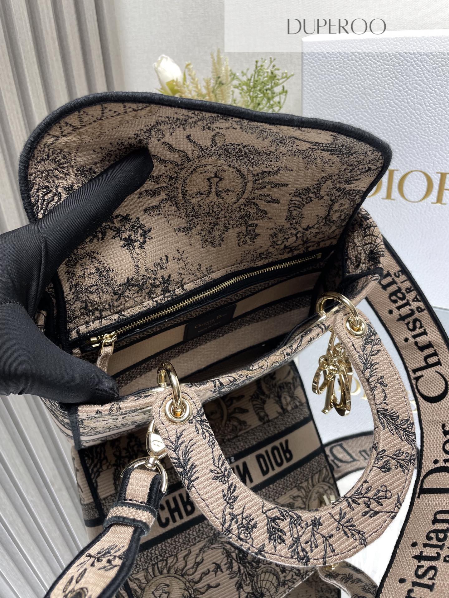 This Christian Dior Beige and Black Lady D-Lite is crafted from embroidered canvas showcasing a “Toile de Jouy” motif.