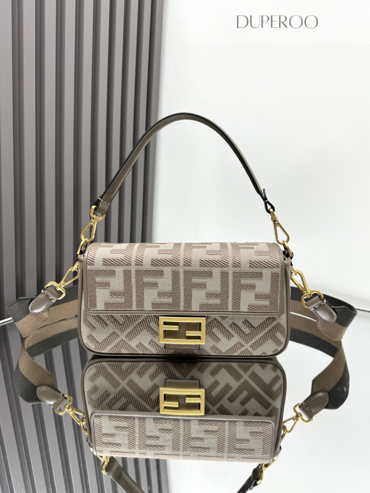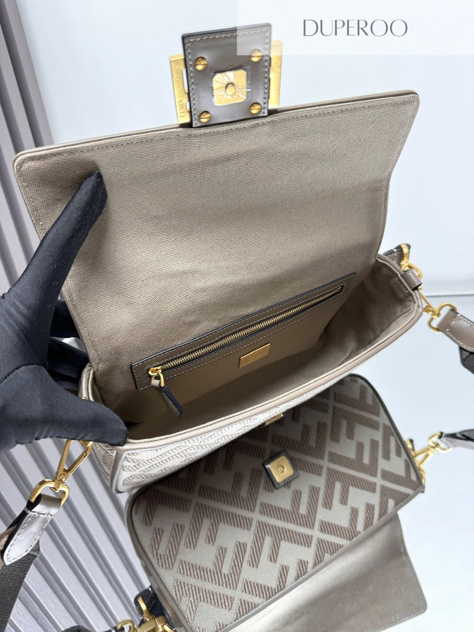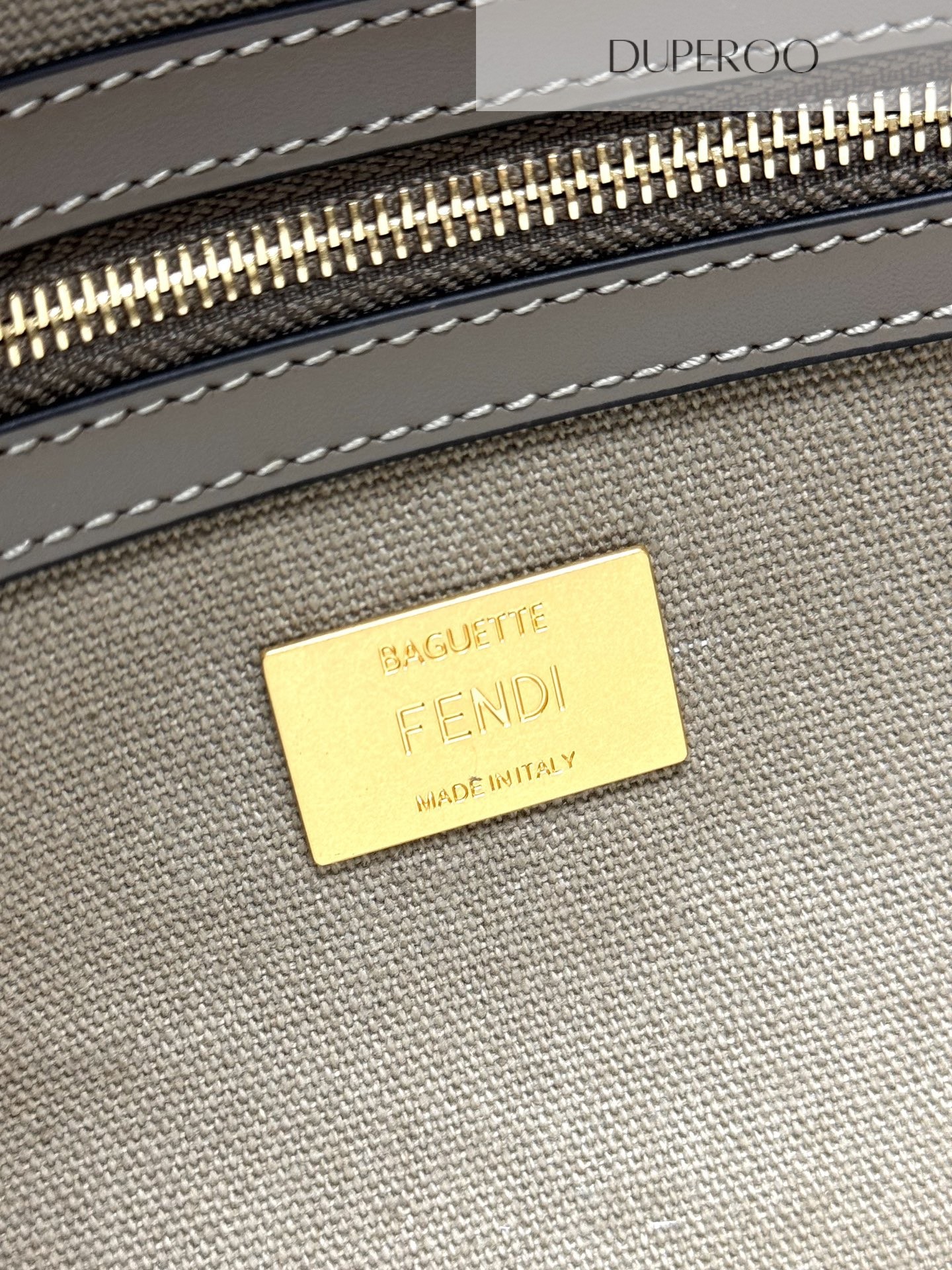This Fendi Baguette Bag in Beige and Brown is crafted from Canvas fabric with gold toned hardware for a versatile timeless appeal.