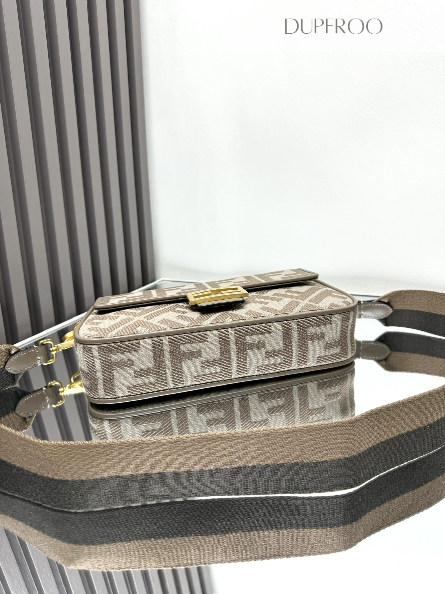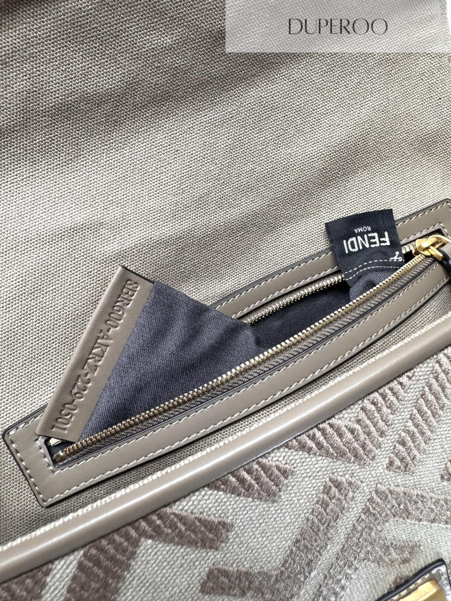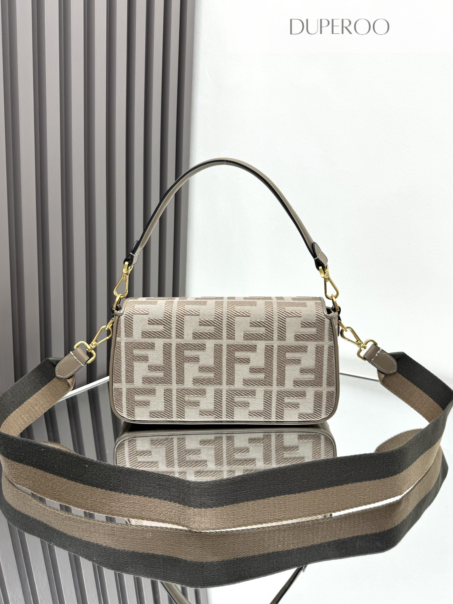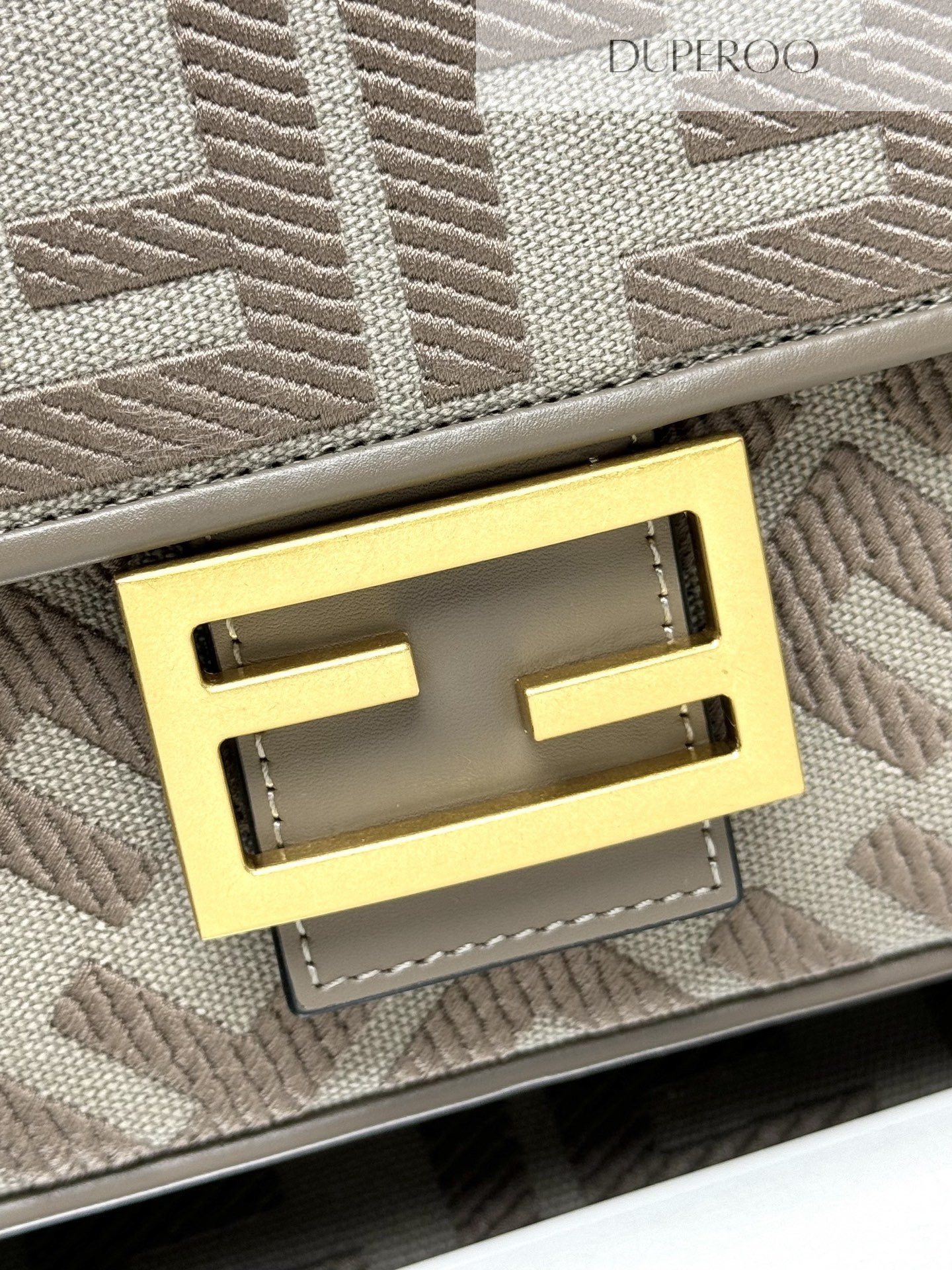 This Fendi Baguette Bag in Beige and Brown is crafted from Canvas fabric with gold toned hardware for a versatile timeless appeal.
