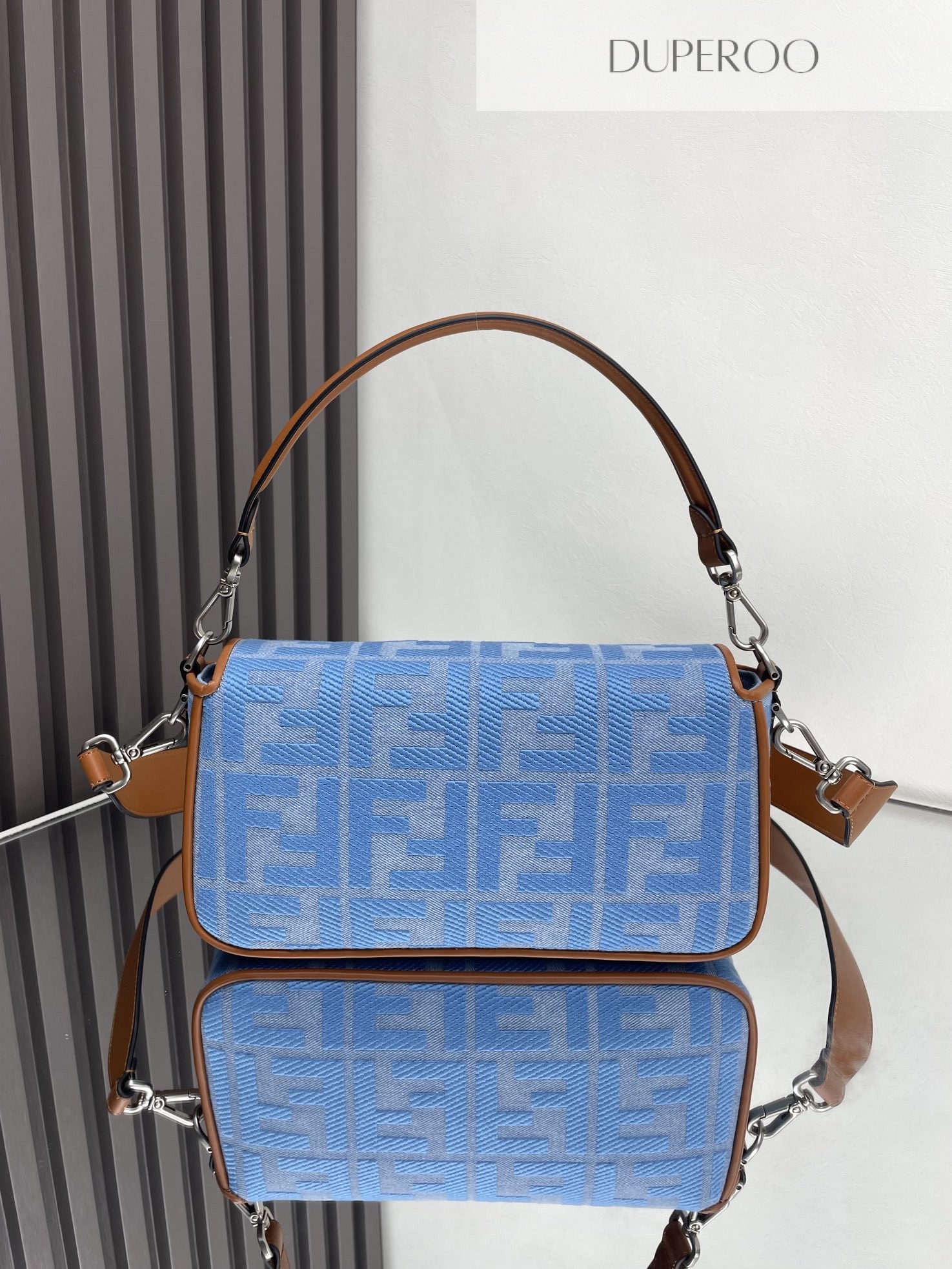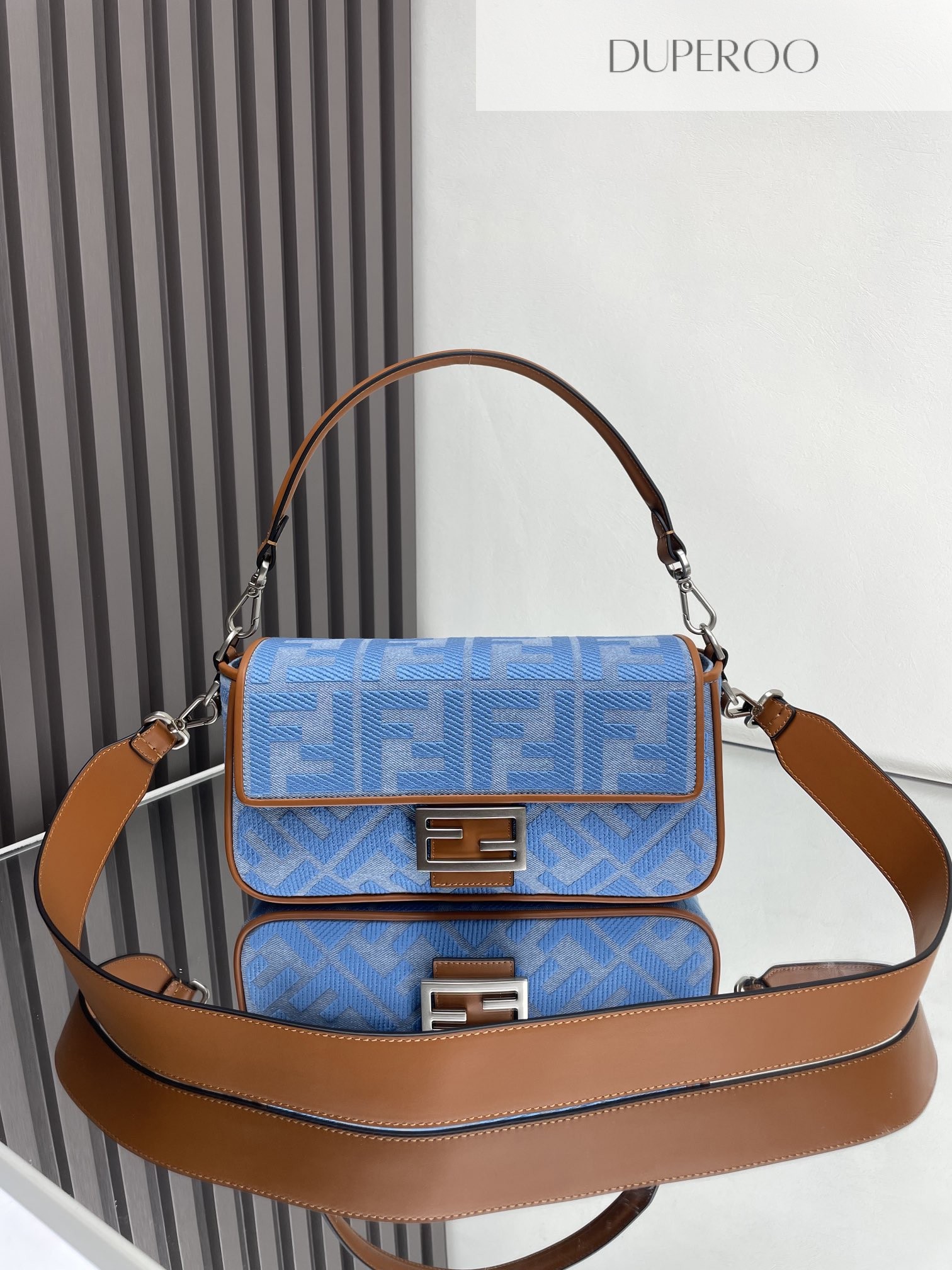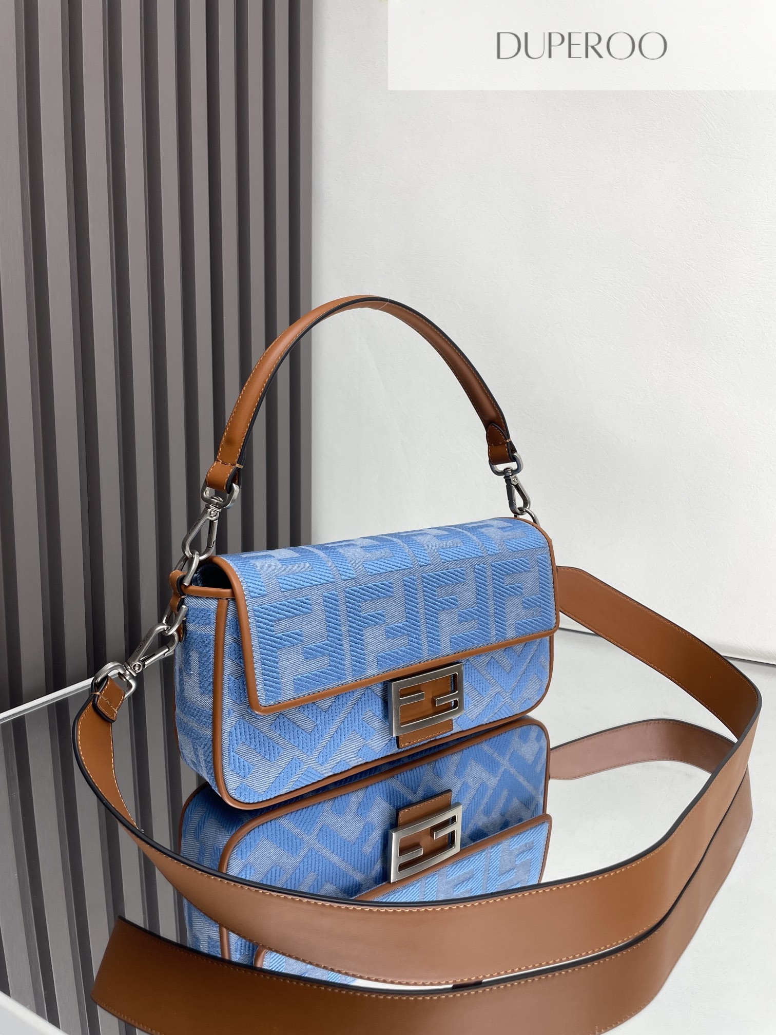 This Fendi Baguette Bag in Blue and Brown is crafted from Canvas fabric with silver toned hardware for a versatile timeless appeal.