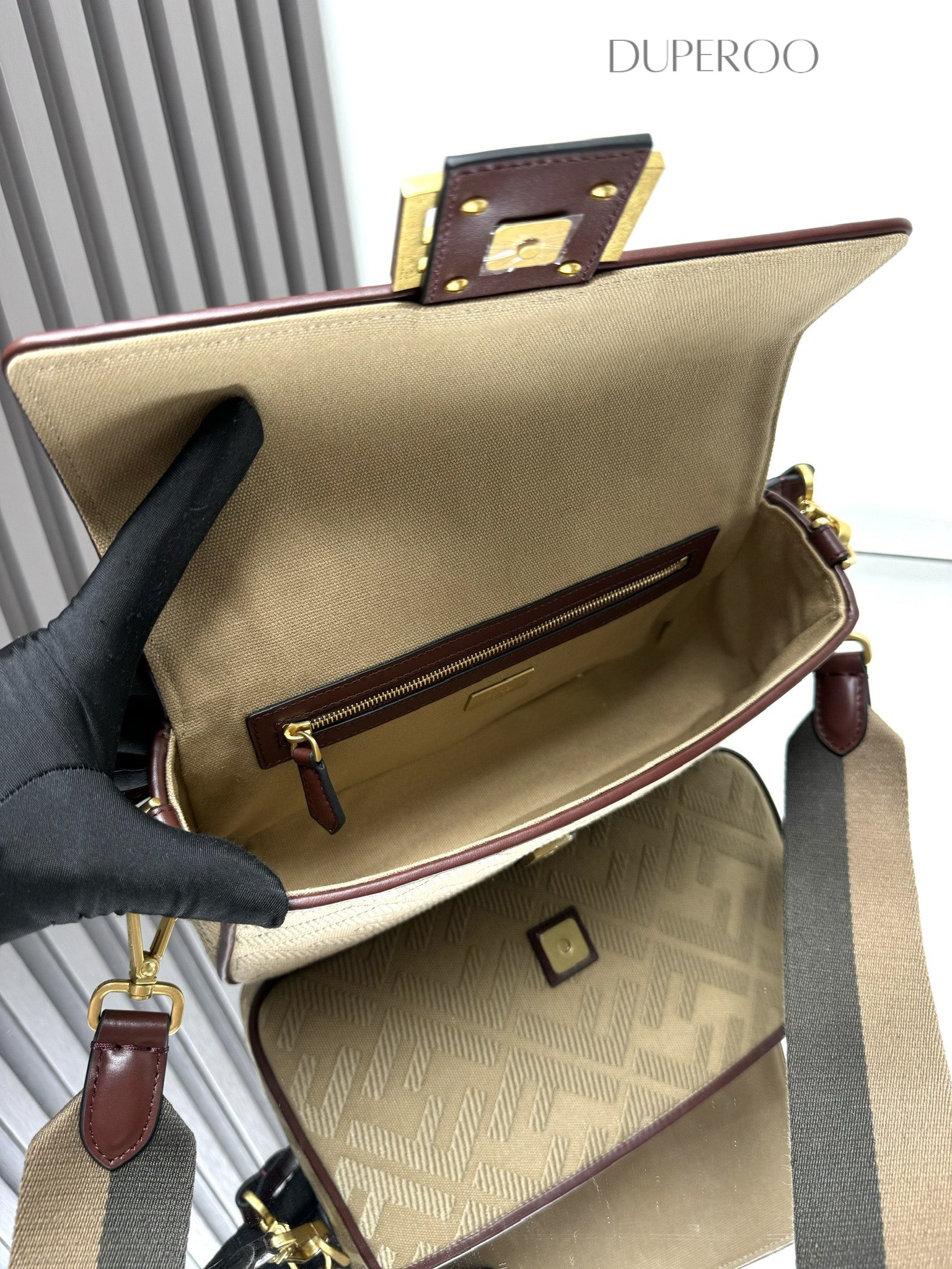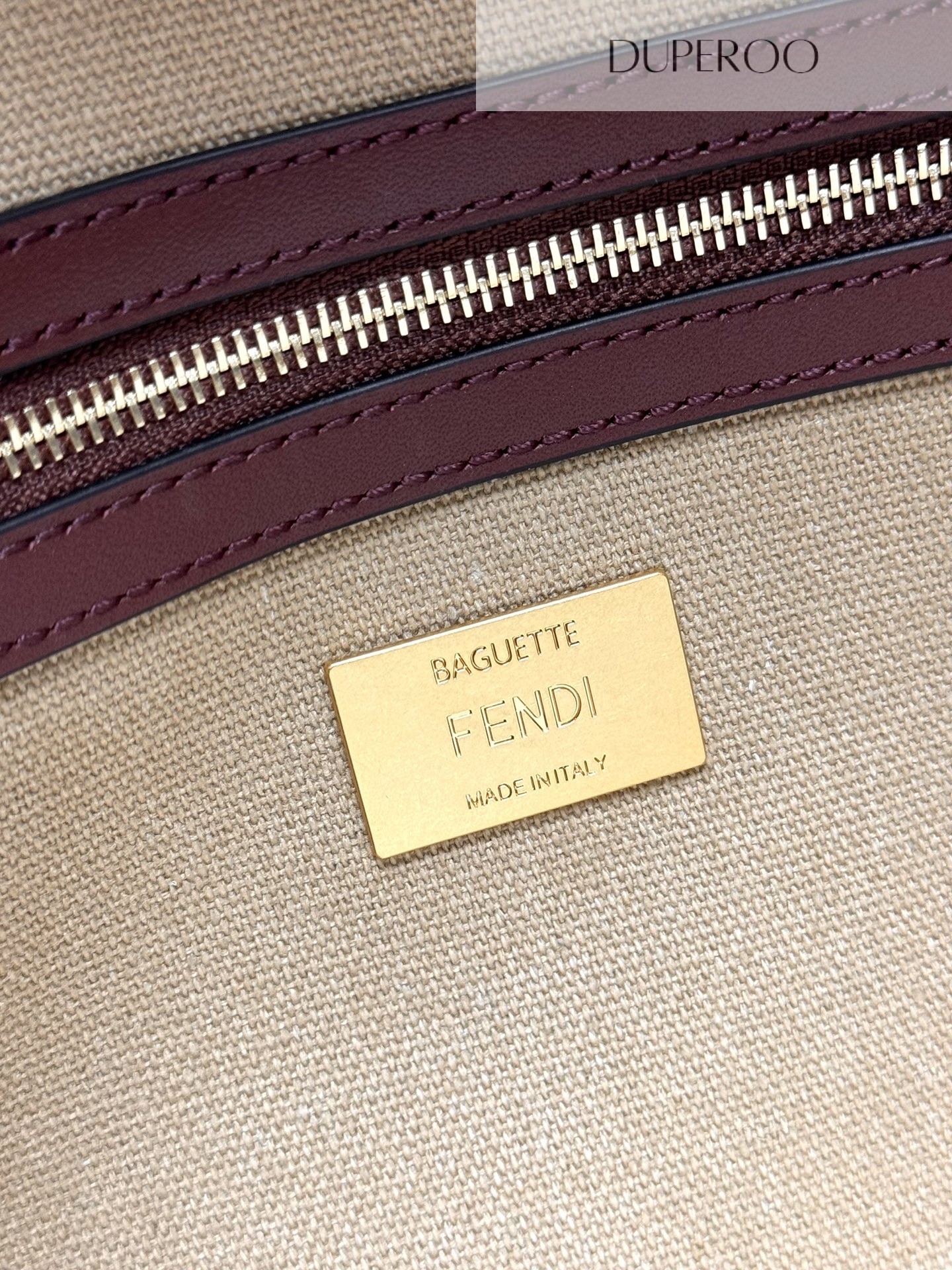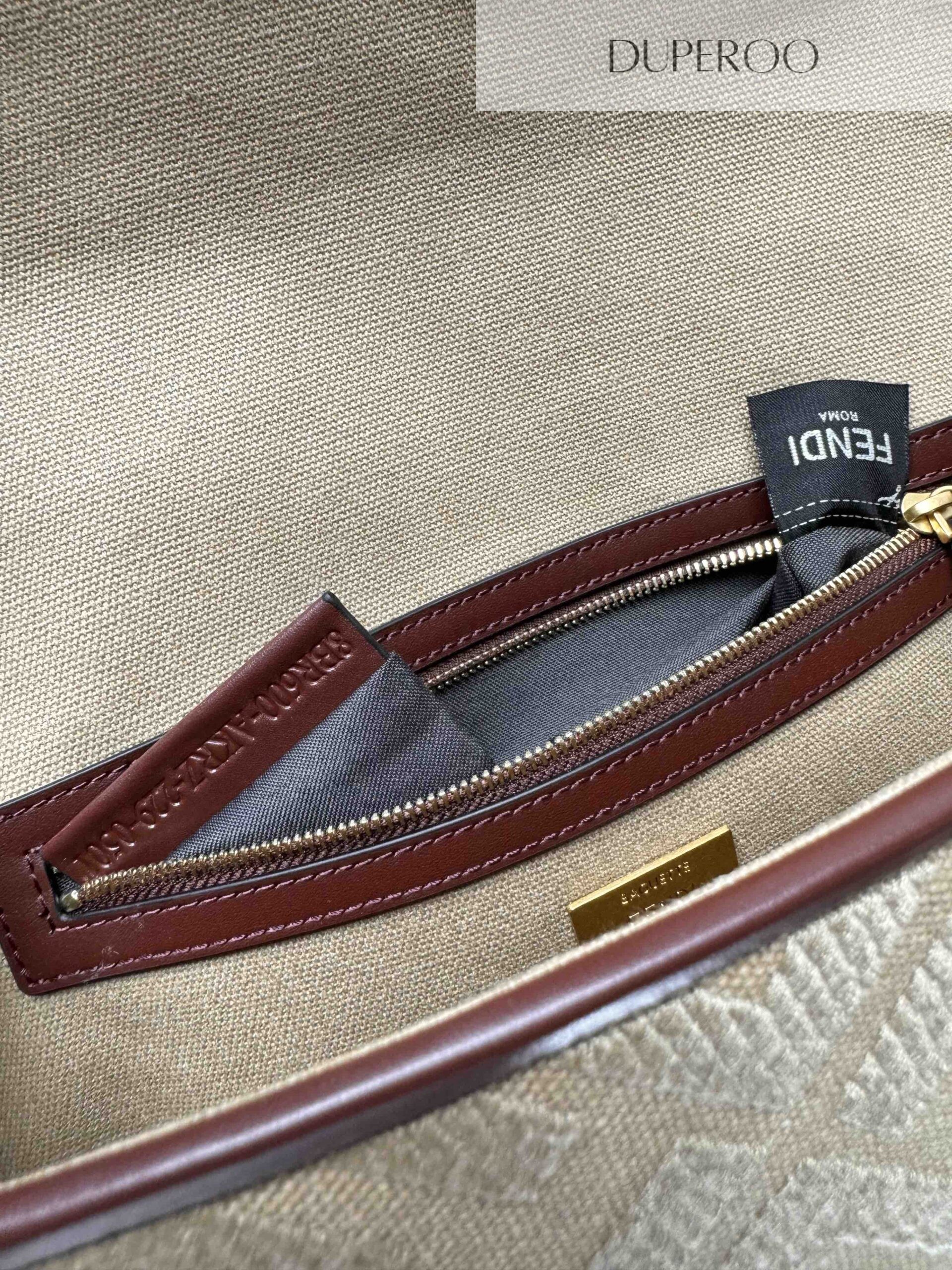 This Fendi Baguette Bag in Light Beige and Brown is crafted from Canvas fabric with gold toned hardware for a versatile timeless appeal.