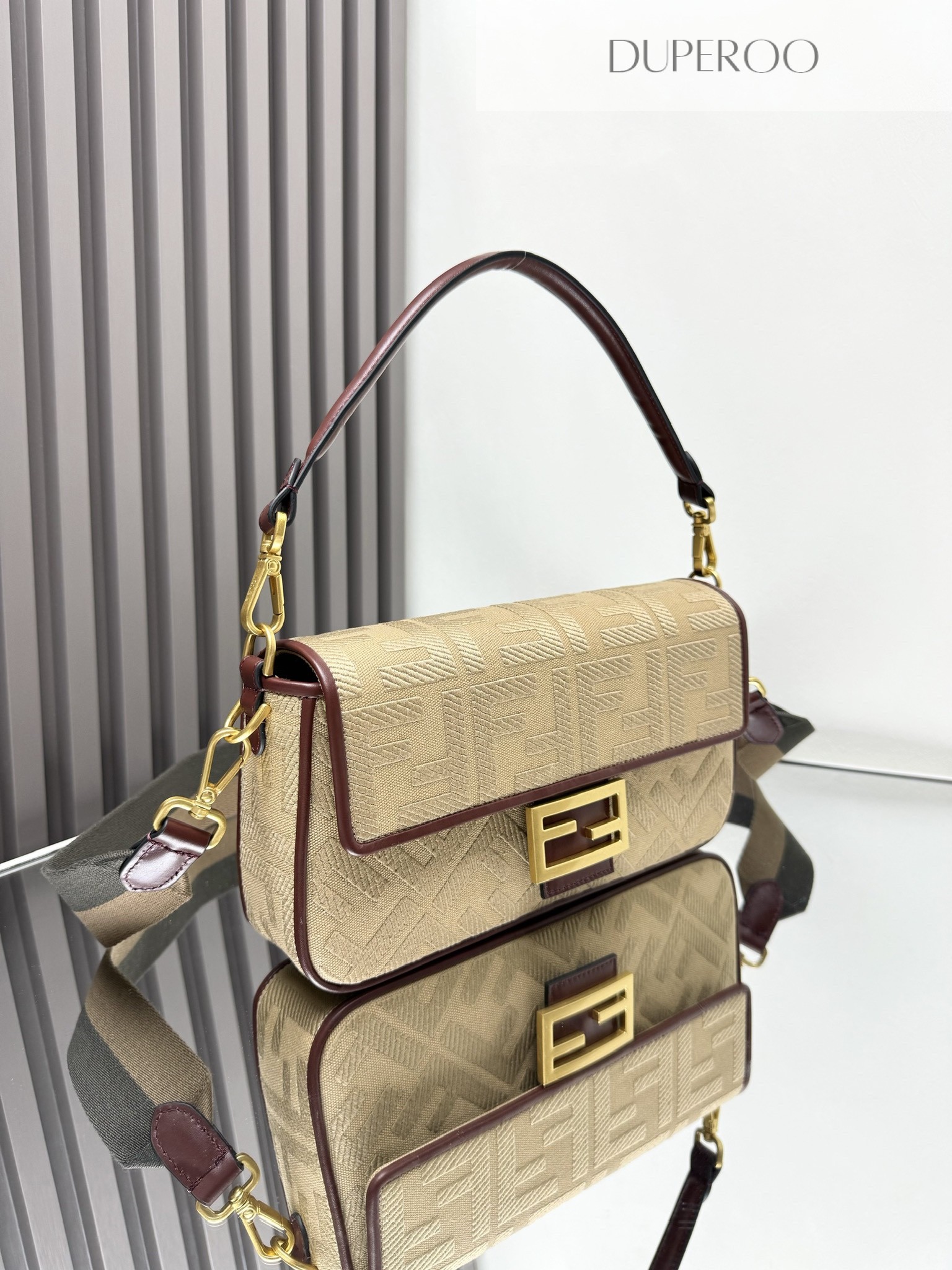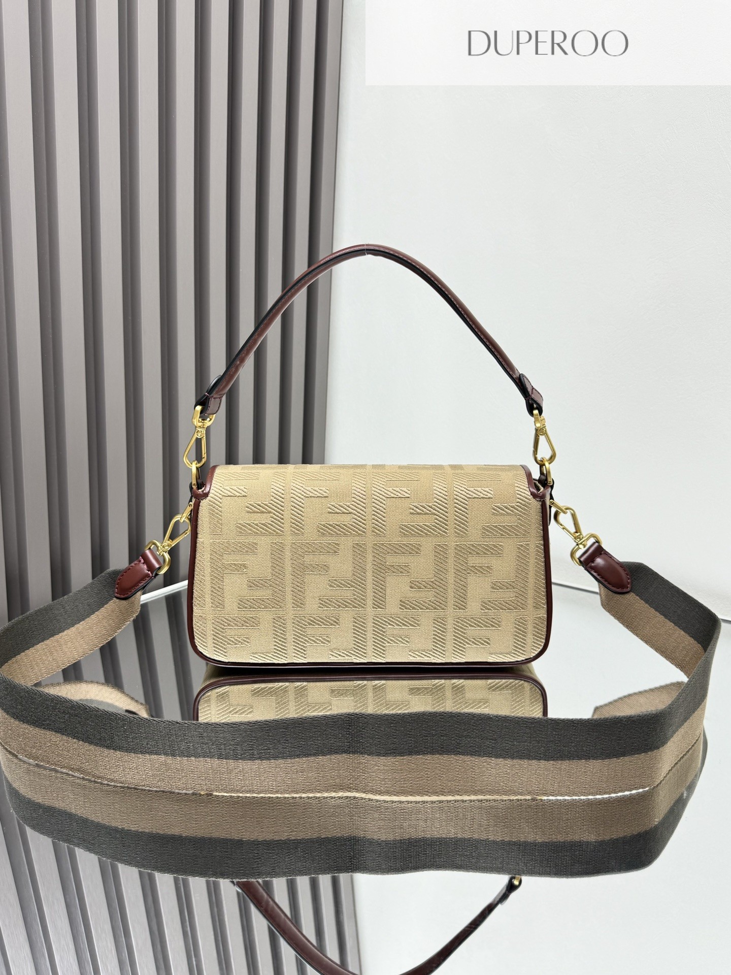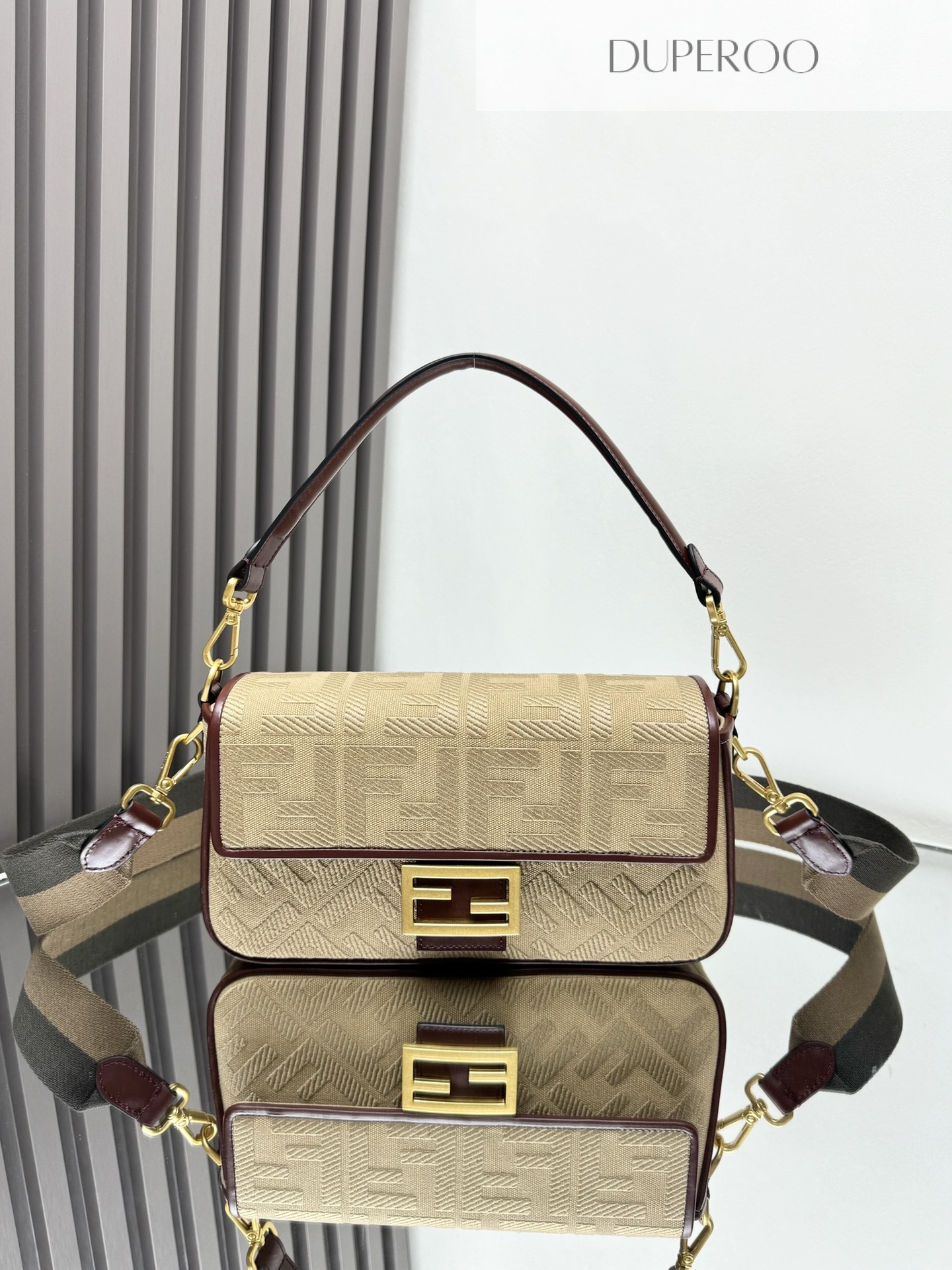 This Fendi Baguette Bag in Light Beige and Brown is crafted from Canvas fabric with gold toned hardware for a versatile timeless appeal.
