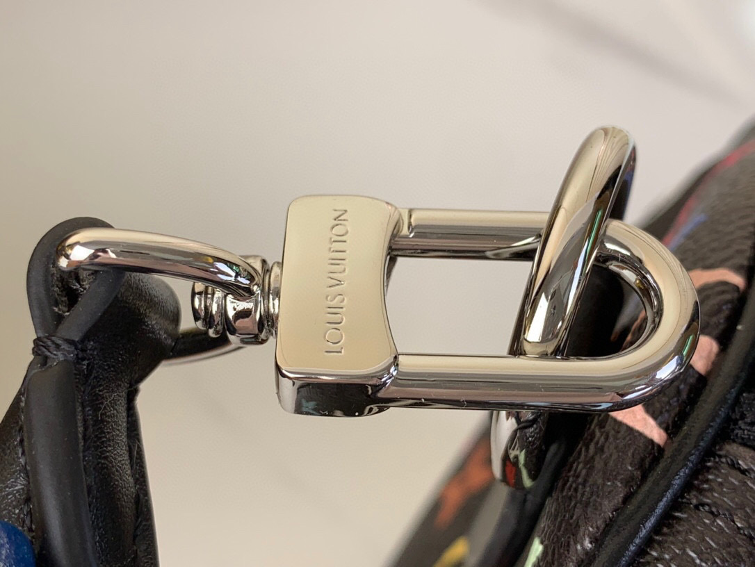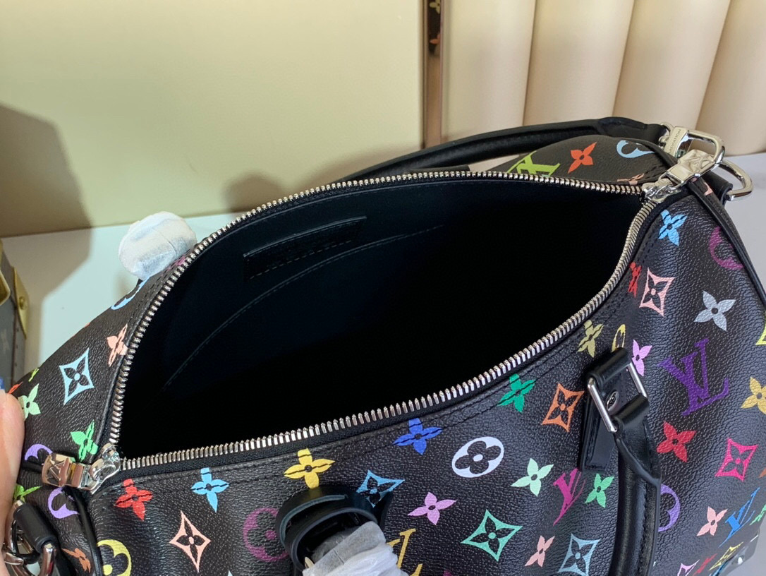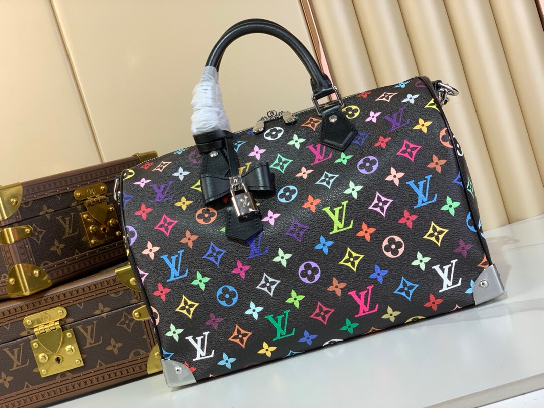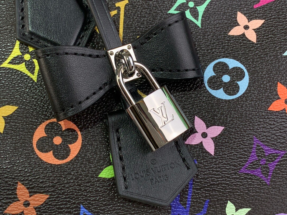 The Louis Vuitton x Takashi Murakami Speedy 30, is in Black monogram multicolored coated canvas leather, with silver-toned hardware. It is a vibrant version of the monogram motif which is refreshed with the Japanese artist’s signature art style. This playful design features a bow-shaped LV x TM key bell.