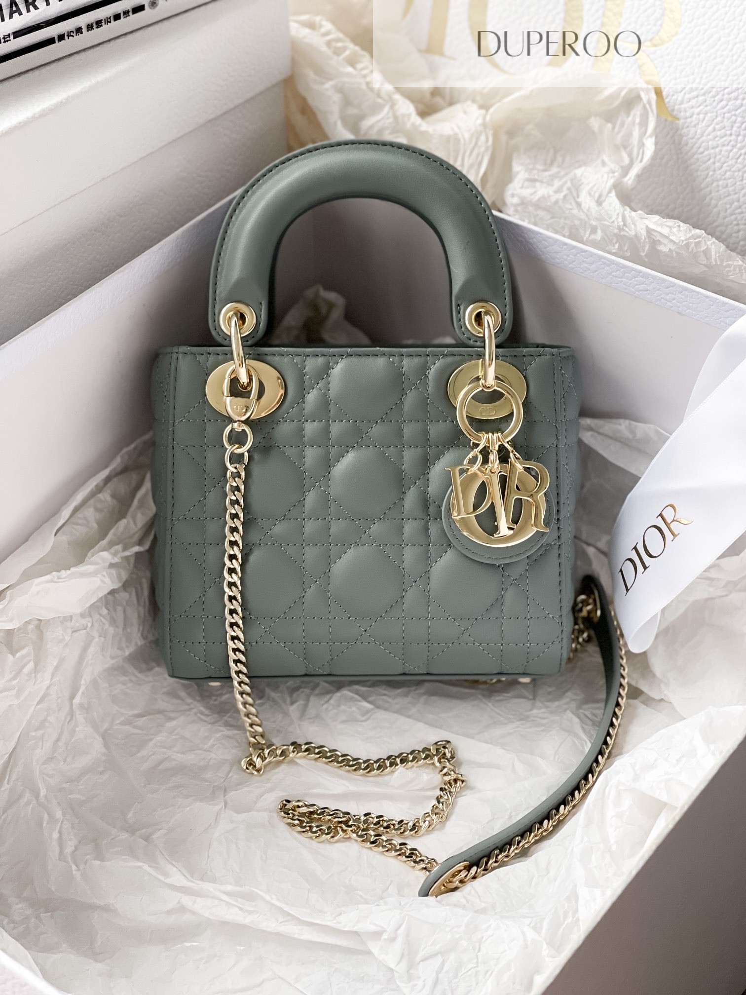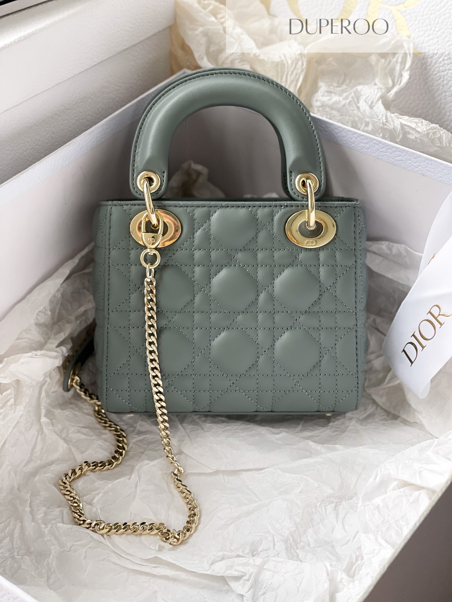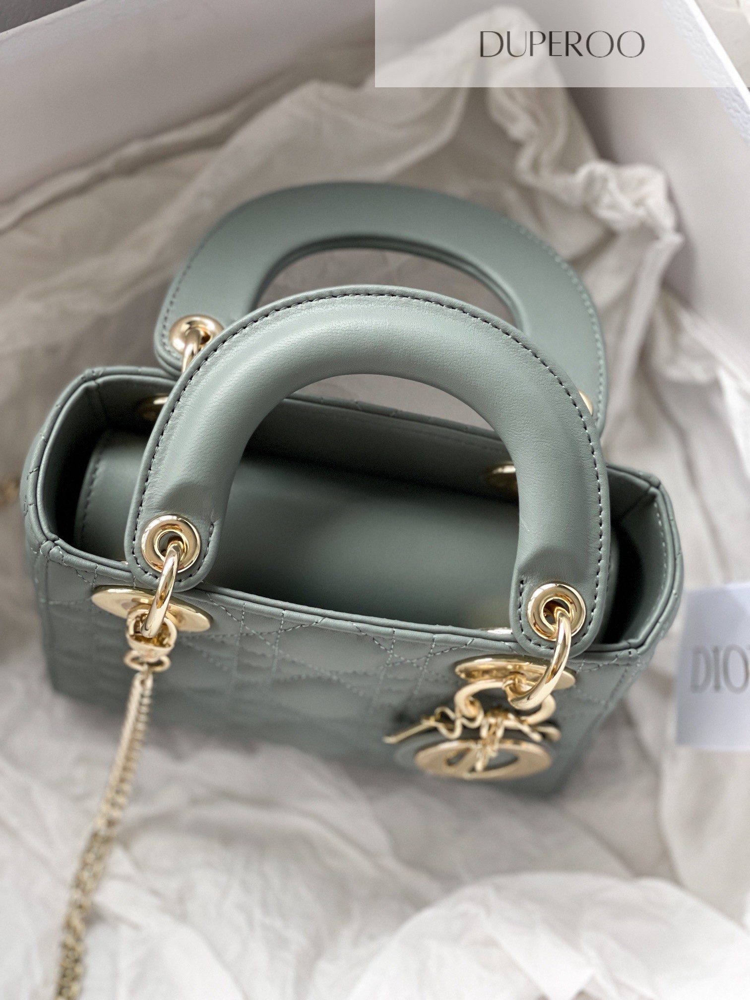This Mini Lady Dior in Green is crafted from from Lambskin with Cannage stitching for a refined and sleek finish.